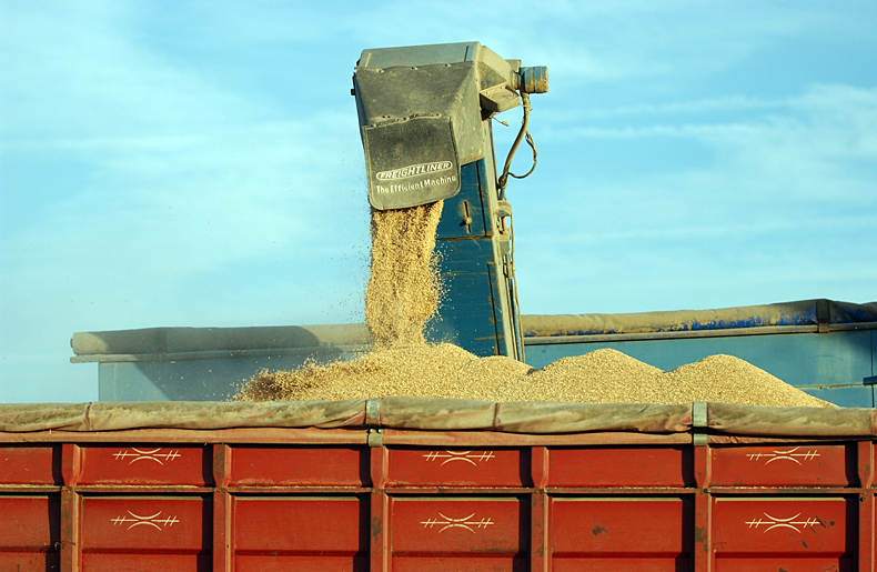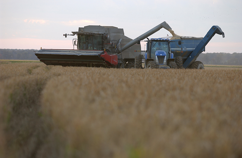 A GLEANER R65 combine equipped with a stripper header dumps rice into a buggy for removal from the field.