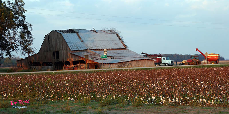 A cotton field with an old barn behind it and International Harvester equipment beside the barn