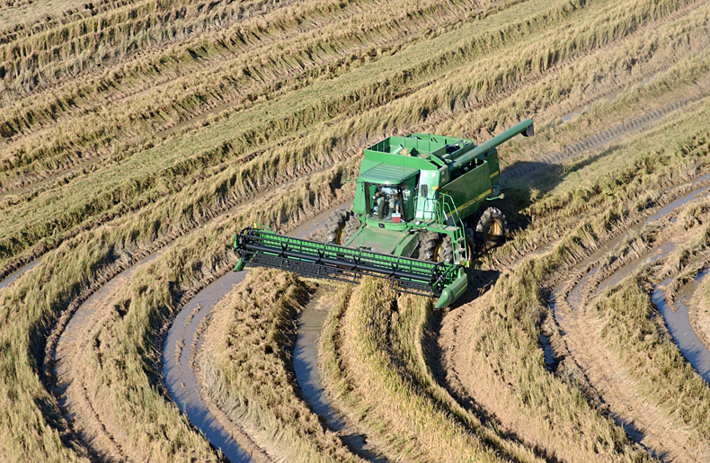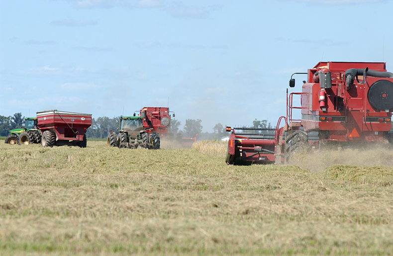 When the rice is ready combines take to the field to cut it. John Deere and International Harvester equipment are working the field in these Arkansas photos.